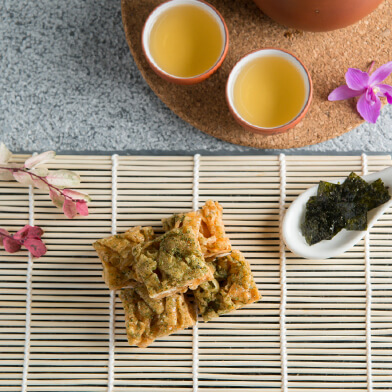 點綴在舞吉黃金酥上的深綠色粉末,是加上海苔的口味,甜甜鹹鹹的古早味,美味營養涮嘴又好吃!